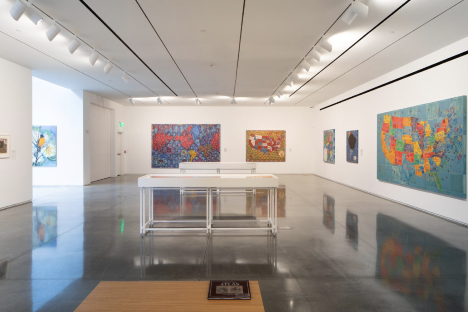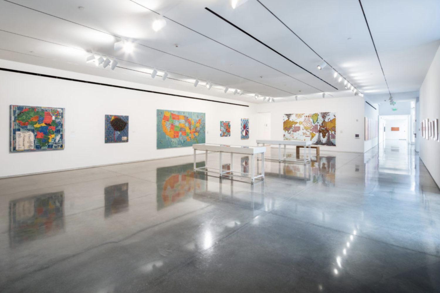 Dan Mills makes work that is full of observations about historic and current events. He conducts extensive research on topics such as current wars and conflicts, colonialism, and life expectancy by state, and creates paintings and works on paper that visualize data/information on the subjects. Mills frequently uses maps as the space to explore these ideas. He began incorporating maps into his work in the early 1990s while researching the quincentennial of what is euphemistically referred to as The First Encounter. Since then, he has explored history and colonization in painting/collages on large roll-down school maps and in an atlas of future states, the loss of history through erasure and over-painting on maps, visualized data about current wars and conflicts in world maps, and data about life, liberty, and the pursuit of happiness on U.S. maps.