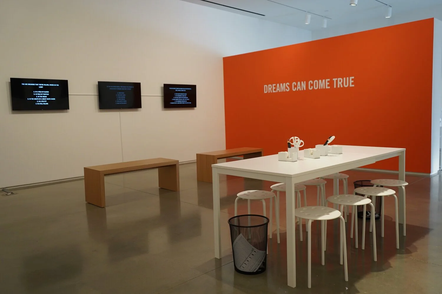 In DREAMS CAN COME TRUE (If it’s not working for you, you’re not doing it right), a series of self-help questionnaires that look to address and solve visitor’s most pressing problems and thus help them to begin living the “life of their dreams” are presented to the audience. Guided by a series of instructions, visitors navigate the installation in search of self-actualization which can be manifested in an interactive model they can build and leave in the gallery. Merchandise can be purchased in the mobile shop. DREAMS CAN COME TRUE explores the impossibility of our collective, endless search for concrete answers and endeavor for self-improvement.