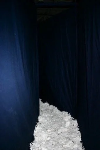 The Bodies Brush Together with a Rustle of Dry Leaves was the result of research I had been dealing with how we perceive uncanny spaces. In particular, this piece looks at the way in which certain elements of nature and the woods at night are experienced, raising questions of how this space is perceived and what constructs one brings when experiencing this environment. The work was constructed of 2 x 4s and fabric to make a narrow corridor and was angled so that one could not see very far ahead of them. The fabric made the space dark and moved as one walked through. On the floor of the corridor was white painted leaves and audio of walking in the woods layered with louder trigger noises.