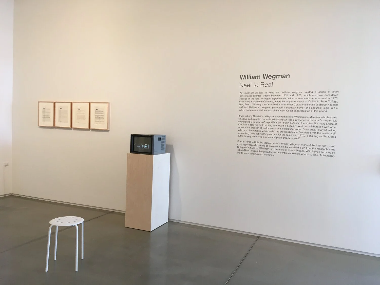 An important pioneer in video art, William Wegman created a series of short performance-oriented videos between 1970 and 1978, which are now considered classics in the field. He began experimenting with the new medium in earnest in 1970, while living in Southern California, where he taught for a year at California State College, Long Beach. Working concurrently with other West Coast artists such as Bruce Nauman and John Baldessari, Wegman perfected a deadpan humor and absurdist logic in his videos that came to define much of the West Coast conceptual art of this period. Reel to Real will feature these early videos and drawings, also from this time.